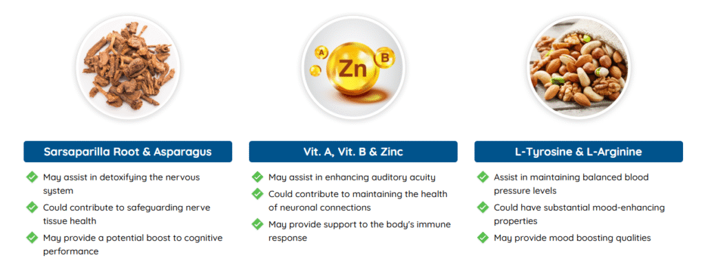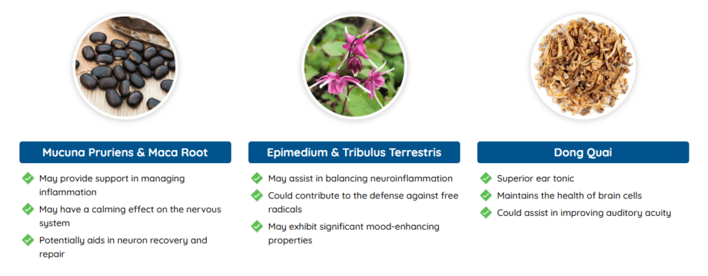 Hops extract and motherwort have calming properties backed by studies on nervous system relaxation. Reducing nerve excitability is important for managing discomfort and improving overall ear function.